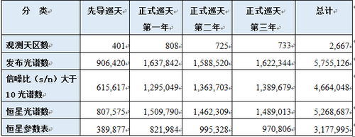 LAMOST DR3光谱数据获得于2011年10月至2015年6月四年的巡天观测任务,共包含575万条光谱,其中信噪比大于10的高质量光谱达到了466万,发布数据中还包括一个317万颗恒星的光谱参数星表,已然是目前世界上获取的最大恒星光谱参数星表。这批数据已在2015年12月对国内天文学家和国际合作者率先发布,保护期过后,数据第一时间对全球开放共享。DR3数据包含的具体信息如下: