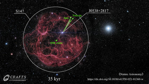 超新星遗迹S147及脉冲星J0538+2817运动(velocity)和自旋(spin)方向示意图(制图:黄琨、王培)