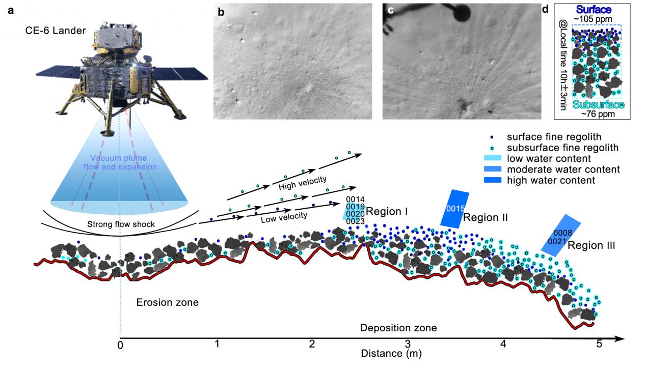 研究团队经过分析研究提出了一种月面双层水含量分布模型来解释上述现象。由于月球无大气,其表面细粒风化层具有很好的绝热性,使得月表以下的次表层存在明显的热梯度,即从表面至~1cm深度,月壤温度会下降~30-50K。此外,细粒月壤较粗粒月壤具有更高的面积体积比,因而太阳风注入形成水的效率更高,使细粒月壤具有更高的水含量。着陆器在下降过程中,羽流首先侵蚀着陆区最上层的细粒成熟月壤,并向各个方向吹扫,在着陆区形成中心侵蚀区和四周沉积区。随着着陆器不断下降,羽流会继续从更深的次表层(~1cm)吹出细粒月壤(图3a-c)。