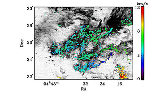 金牛座分子云中发现的765个分子云核。背景为12CO积分强度图。椭圆圈表示云核,颜色标记了云核的速度。