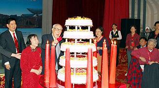 当温馨的生日歌响起,生日蛋糕携带9根火红的蜡烛点燃,庆典达到了高潮,在烛光的映衬下,王先生显得分外精神。在典礼中间,播放了王绶琯院士接受采访的视频,回顾了他六十年科学生涯中的师德之念,谈了自己对老一辈天文学家的理解。庆典最后,王老亲自上台答谢,感谢各界领导对自己的关爱和鼓励,感谢朋友们对自己的加油和打气,并为他举办了永志不忘的聚会,希望中国天文能够在诸位的努力下“厚积薄发”,“好谋而成”,乘风破浪,胜利前进!庆典在一片祝福声中落下帷幕。