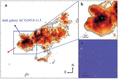 图1.a、反银心高速云复合体 HI 辐射(Arecibo) b、暗星系AC G185.0-11.5 HI 辐射(FAST)c、光学g波段辐射(Pan-STARRS1)