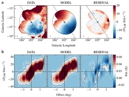 近日,国际科学期刊《科学进展》(Science Advances)在线发表了中国科学院国家天文台FAST团队主导的一项重要研究成果。该研究团队利用国家重大科技基础设施中国天眼FAST和郭守敬望远镜LAMOST,以及紫金山天文台青海观测站的13.7米毫米波望远镜等观测数据,通过深入的动力学分析和三维盘星系模型拟合,解析出银河系的一个致密高速气体云是一个潜在的暗星系(图1)。通过距离的估算,确定该暗星系位于本星系群中。
