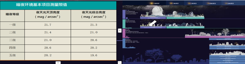 《暗夜环境等级划分》标准给出了暗夜环境夜天光分级的原则和暗夜环境分类要求,对暗夜环境、天空背景亮度、V波段视星等、天空背景天顶亮度、天空背景综合亮度进行了科学准确定义,并按照天空背景天顶亮度值和天空背景综合亮度值将暗夜环境共划分为5级暗夜。同时根据暗夜环境的优先级,将暗夜环境区域分为暗夜科研区、暗夜自然区、暗夜保护区、暗夜科普等4个区。
