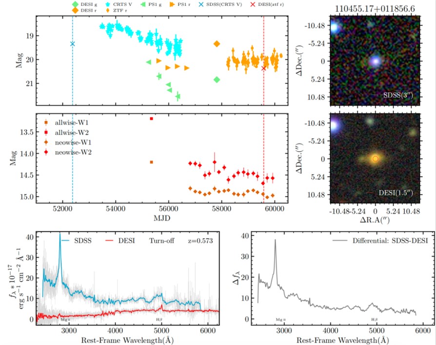 图1.基于DESI数据的CL-AGN示例。图中展示了该天体的多波段观测数据:约20年的光学和红外光变曲线、SDSS与DESI的光谱对比,以及不同时期的光学图像。光学图像显示,该天体从SDSS时期的AGN主导的明亮核区特征转变为DESI时期的星系主导形态,也证实了其活动星系核状态的显著变化。