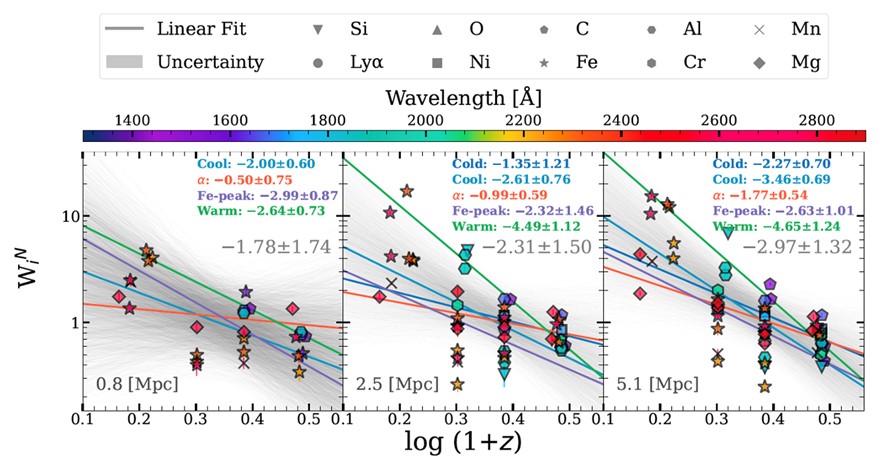 研究团队通过叠加类星体光谱,利用不同元素的特征吸收线强度信息,成功重建了类星体周围气体的空间分布。这一方法犹如利用“宇宙光针”进行星系际介质的演化追踪。研究结果显示类星体周围金属离子的吸收强度随红移的增加呈现出系统性减弱趋势,符合W∝(1+z)-4的演化规律。值得一提的是,不同离子的演化特征存在显著差异,彰显出星系周围气体复杂的多相结构。