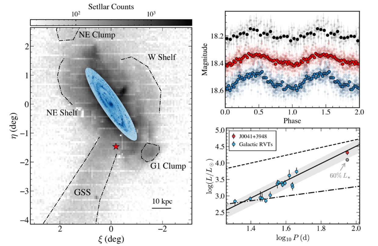 图1. 左图:LAMOST J0041+3948在M31的空间位置示意图,背景反映的是M31中的红巨星数密度分布,晕中主要的子结构用黑色点虚线标出。右上图:相位折叠后的恒星光变曲线。右下图:长周期RV Tauri变星的周期-光度关系,J0041+3948用红色点表示,蓝色点代表银河系中的长周期RV Tauri变星样本,黑色虚线代表LMC中经典造父变星的周光关系,黑色点虚线反映LMC/SMC中短周期II型造父变星的周光关系。