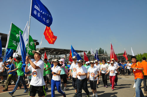 国家天文台经过认真筹划准备,派出5男5女共10人组成的精英队代表国家天文台参加了本次比赛,其中包含4名研究员。上午9点整,随着发令枪响,在蓝色台旗的带领下,队员们如离弦之箭,在纷繁的队伍中脱颖而出,一路领先。快的带慢的,缓的跟疾的,或互相加油打气,或调节一下气氛。10人的队伍始终保持着队形,斗志昂扬;与天空一色的台旗高高飘扬,美丽而夺目。