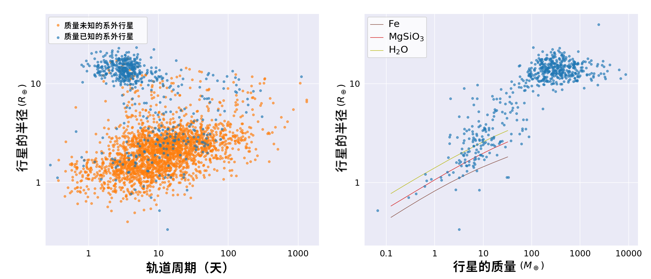 已经证认的凌星行星的轨道周期与半径的关系(左图),以及轨道周期与质量的关系(右图)。左图中的黄色点代表质量未知的行星,它们在右图中都是不存在的。右图中的实线代表不同化学组成的行星的轨道周期——质量关系(取自Zeng et al. 2016)。