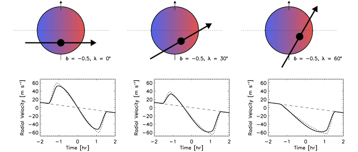 RM效应的示意图。恒星由于自转,其圆面中一半朝向观测者运动,另一半朝着远离观测者运动。当行星从圆面前方经过时,会挡住一部分光,谱线的左右两侧轮廓对称性会发生变化,导致测量到的视向速度曲线出现反常。根据反常的形状可以得到行星的轨道倾角。图片取自 WASP Planets
