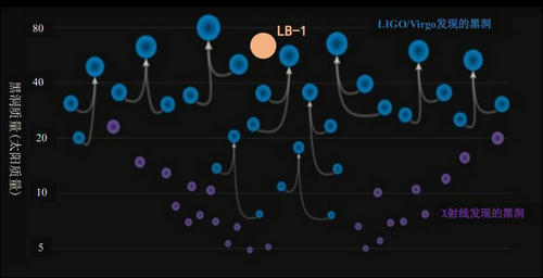 图 2 LB-1和引力波并合事件、X射线方法发现的黑洞的质量分布
