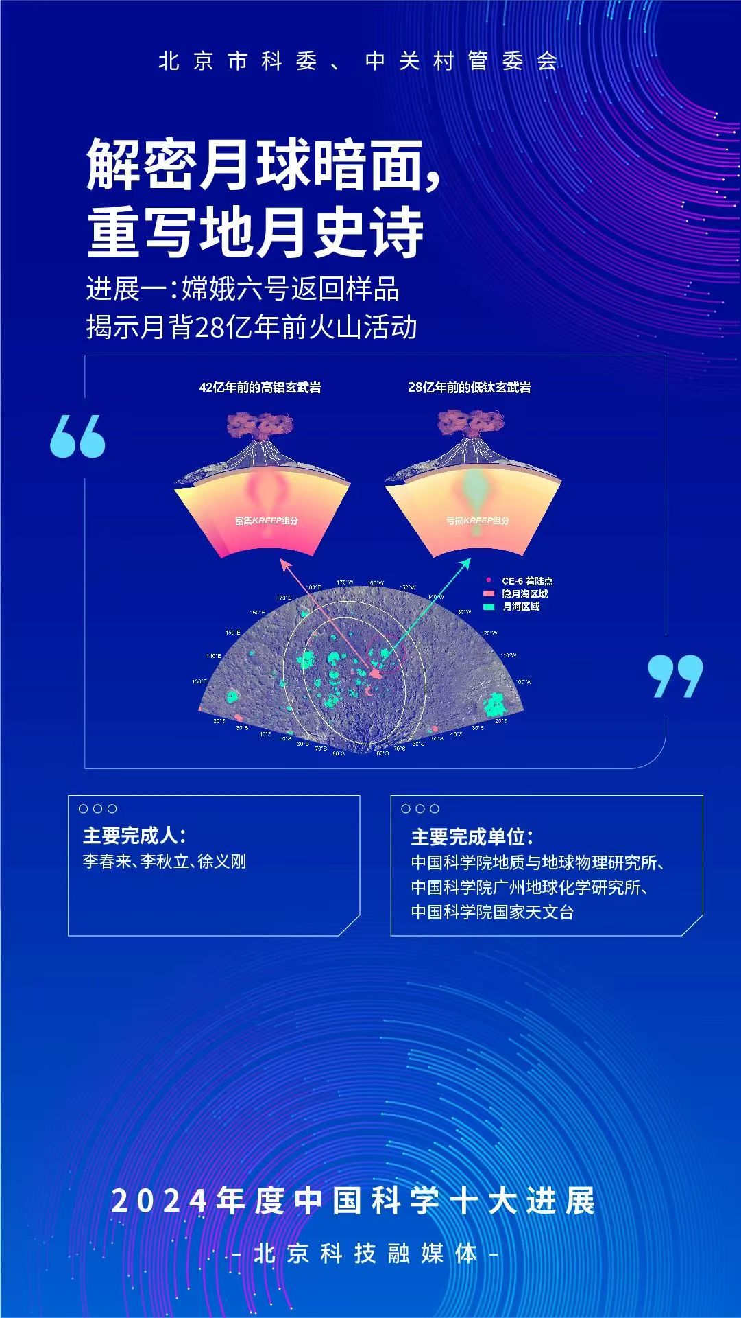 3月27日,国家自然科学基金委员会发布2024年度“中国科学十大进展”,中国科学院地质与地球物理研究所李秋立、广州地球化学研究所徐义刚和国家天文台李春来等共同主持成果“嫦娥六号返回样品揭示月背28亿年前火山活动”入选。