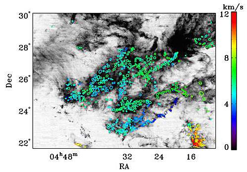 金牛座分子云中发现的765个分子云核。背景为12CO积分强度图。椭圆圈表示云核,颜色标记了云核的速度。