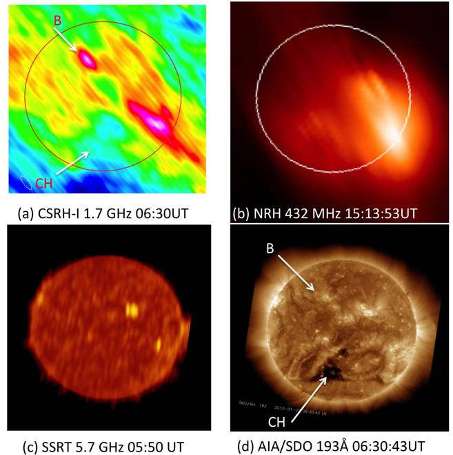 图:2013年1月22日6:30 UT由CSRH低频阵观测经CASA软件处理获得的30ms积分图像(a),同日法国南茜天文台(b)和俄罗斯十字阵(c)在不同频率上的射电图像,以及SDO卫星193埃波长的极紫外图像(d)。这几天太阳一直处于宁静状态,没有爆发活动。注意CSRH低频阵1.7 GHz图像中的亮源B在432 MHz和5.7 GHz图像中均无显著辐射,但是在极紫外图像上明显对应着亮冕环结构,射电辐射弱的区域对应着冕洞(CH)。