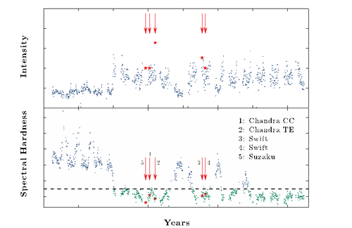 上图:日本在国际空间站上的监视器MAXI观测的天鹅座黑洞强度时间演化图。下图:相对应的光谱硬度图(光谱硬度越低,表明吸积盘成分占主导,虚线之下的数据适合于自旋测量分析)。图中箭头和星号标明了各个卫星的观测时间。