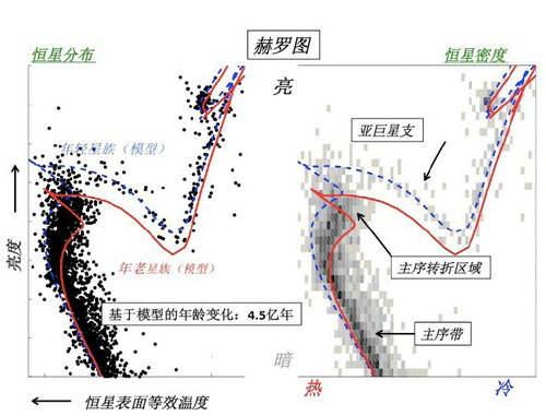 恒星一生的大部分时间,都在核心以氢核聚变(氢原子聚合成氦原子)反应维持自身发光发热,这样的恒星称为“主序星”,它们分布在“赫罗图”(恒星颜色和亮度分布的二维图)的主序带上。当恒星核心的氢原子全部燃烧完时,核心周围壳层的氢元素就开始燃烧,此时恒星就进入“转折区域”,演化到“亚巨星”带上,单星族恒星分布的亚巨星带十分狭窄。近十几年以来,人们对年龄在10亿到30亿年的大质量星团(质量在50000个太阳质量以上)观测发现:它们的恒星在赫罗图上呈现出一个展宽的转折区域,这一现象长期被解释为恒星的年龄存在3亿年左右的弥散(它们不是同时形成的)。