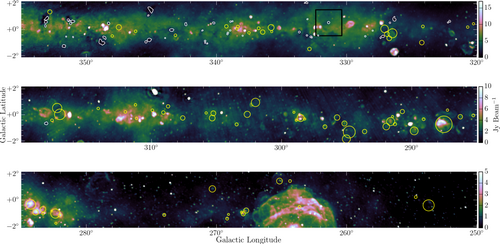 MWA望远镜在88MHz观测到的银道面二维图像.大部分的弥漫辐射来自同步辐射.白色多边形表示观测到的吸收区,黄色圆圈表示没有吸收现象的HII区.视线方向的辐射分布通过吸收测量得出.更多结果参见arXiv原文:https://arxiv.org/abs/1611.05446