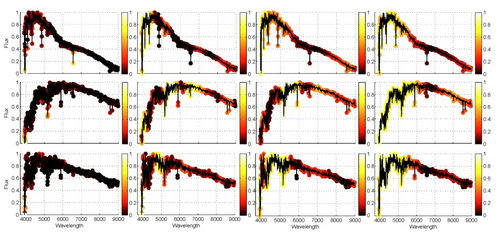 该新模型应用于LAMOST光谱分类中不同波段对分类结果影响的可视化结果。从上至下分别为随机选出的F、G、K型星光谱;从左至右分别为使用不同大小的滑动窗口遮挡输入光谱的各个波段,不同颜色代表相应的波段对分类结果的影响,颜色越浅的波段对分类结果的影响越大。