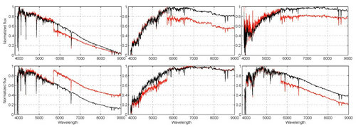 利用该新方法修复LAMOST光谱的实例,图中红色为原始光谱,黑色为修复后的光谱。