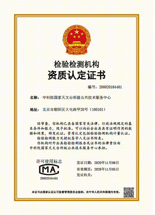 11月10日,国家天文台所级公共技术服务中心获得国家级检验检测机构计量认证CMA资质。证书编号为200020164401,授权范围涉及5大类16个参数,资质有效期为6年。该资质的获得标志着我台所级中心具备出具第三方检验检测机构证明的行政许可。