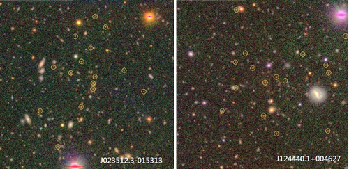图1:两个高红移(分别为z=1.46和1.62)星系团的riz合成图像(取自HSC-SSP),黄色圆圈表示星系团的成员星系。