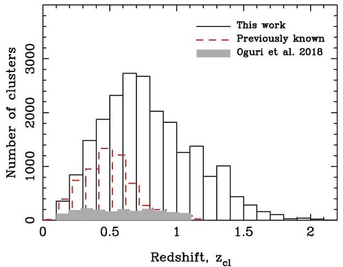 目前天文学家普遍相信,少数星系团在红移2.0左右已经形成。文中略和韩金林结合了国际上两个巡天的数据[Hyper Suprime-Cam Subaru Strategic Program (HSC-SSP) 光学数据和Wide-field Infrared Survey Explorer中红外数据],估计出一千四百多万个大质量星系的红移,并由此证认出21661个星系密度非常超出的星系团,具体星系团图像如图一。星系团的红移在0.1-2.0之间,其分布见图二。其中,红移大于1的星系团有5537个,红移大于1.5的星系团有642个。在此之前,红移大于1的星系团仅有约2千个,红移大于1.5的星系团仅有约50个。这些新证认出的星系团能够探索更深区域的宇宙结构,因此,他们新发现的星系团为宇宙结构和星系演化研究扩展了宇宙疆域。