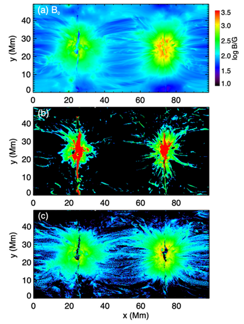 图1:模型中的日冕磁场强度。b:假设Fe X谱线形成温度总是100万度时利用Fe X 257/174埃强度比得到的磁场。c:同时诊断温度和密度后利用Fe X 257/174埃强度比得到的磁场。