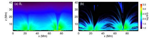 图2:模拟临边观测的结果。(a)模型中的日冕磁场强度;(b)用MIT方法计算出的磁场强度。