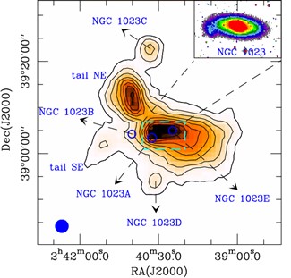 图1. S0星系NGC 1023的中性氢辐射图。右上小图是其光学DSS-B波段辐射图