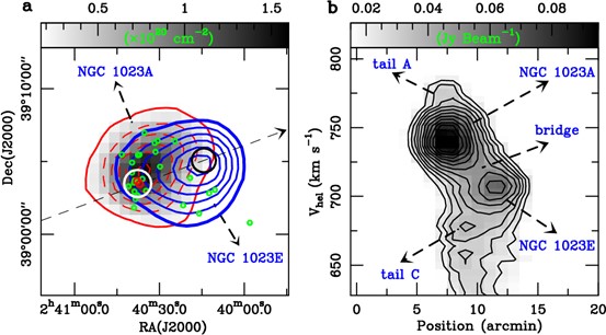 宇宙中一半以上的透镜星系是被发现位于星系群中。位于一个近邻星系群中的NGC 1023是目前所有发现的透镜星系中,距离我们最近的气体丰富的大质量透镜星系。通过使用高灵敏度和高谱分辨的FAST对NGC 1023进行中性氢(HI)观测,解析出该透镜星系在与四个矮星系相互作用(图1)。特别是发现其中一个最大的矮星系已经掉入到NGC 1023的气体盘中,与盘中的一个大质量气体团块形成了一个罕见的亮-暗星系对,并触发了年轻的星团形成(图2)。该大质量气体团块被发现具有与矮星系相同的物理、动力学特征,但没有光学对应体,表明其可能是一个新形成的原星系。最后,通过结合光学等多波段数据的动力学分析,给出NGC 1023是在一群矮星系的潮汐作用下通过形态转化所形成。