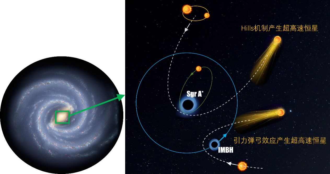 图1. 银河系(左图)中心产生超高速恒星的两种机制的示意图(右图)。一种是靠近超大质量黑洞Sgr A*的双星系统被黑洞的潮汐力瓦解后,其中一颗恒星获得极高速度并射出(Hills机制);另一种是在系统中有另一颗绕转Sgr A*的中等质量黑洞(IMBH)时,靠近其轨道的恒星因引力弹弓效应而高速射出。银河系图片来源:NASA/JPL-Caltech。