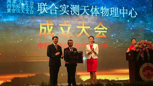 9月30日,国家天文台-西华师范大学共建天文系和国家天文台-西华师范大学-紫金山天文台联合实测天体物理中心成立大会在西华师范大学华凤校区成功举行。出席大会的有中国科学院紫金山天文台熊大闰院士,中国科学院国家天文台武向平院士,中国科学院国家天文台南京天文光学技术研究所崔向群院士,国家自然科学基金委员会数理学部副主任董国轩,中国科学院国家天文台纪委书记石硕,中国科学院紫金山天文台纪委书记毛瑞青,南充市市委常委、宣传部长何迎晓,西华师范大学党委书记王安平,党委副书记、纪委书记聂应德,副校长李健,原西华师范大学党委书记杨树政,以及来自北京大学、清华大学、国家天文台、紫金山天文台、上海天文台、中国科学院大学、西交利物浦大学、南京昊天天文仪器设备有限公司等30余个兄弟院校和天文台(馆)的专家学者。
