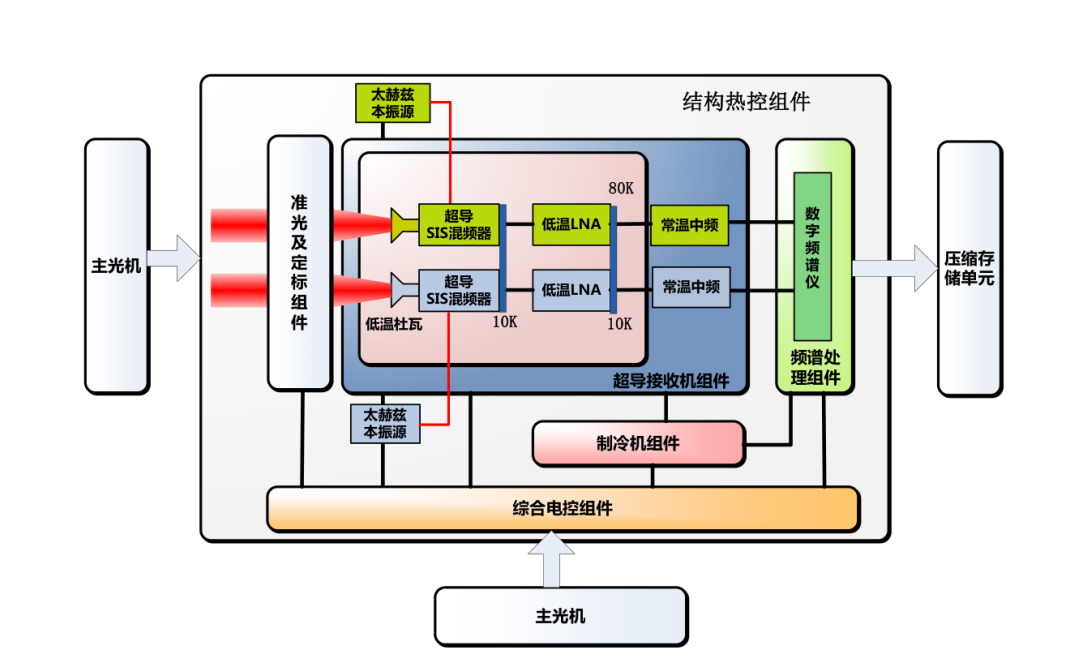太赫兹谱仪(TS)将主光机接收的 0.41-0.51THz 太赫兹信号与本振信号源产生的信号在超导混频器(制冷机提供 8 K 工作温度,混频器工作在超导状态)上实现混频,然后将混频得到的中频信号进行傅里叶变换,得到观测信号的频谱信息。太赫兹谱仪两个通道各自的瞬时带宽达1GHz 以上,频率分辨率优于 100kHz,200s 积分的仪器灵敏度优于150mK(3σ),当前主光机与太赫兹谱仪常压条件系统级测试处理后的系统灵敏度为 210mK。
