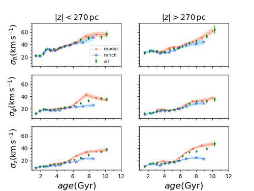俞锦程等人利用LAMOST观测数据,结合GAIA数据,通过新的统计方法,建立了银河系盘上完整的三维速度信息,从而精确地给出了恒星年龄与速度弥散度的关系(见图)。他们的发现成功验证了银盘的加热机制。