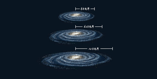 2017年底国家天文台刘超研究员等率先利用LAMOST数据向传统认知发起挑战,通过应用复杂统计手段精确清点银河系外围恒星的数目,他们成功绘制出银盘外围的空间结构剖面图。从图中可以看出,银盘的恒星数目虽然在随着银盘半径减少,但并没有在5万光年处停下来,而是一直延伸到距离中心6.2万光年处(图中红色和白色的区域是银盘,蓝色是银晕)。 这比教科书上一直以来引用的半径大了约四分之一!