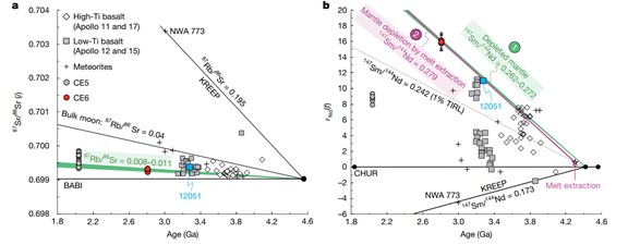 图1:月球玄武岩的月幔源区Rb-Sr(a)和Sm-Nd(b)同位素演化模型。CE-6玄武岩源区亏损的Nd同位素组成可能通过以下两种方式产生的:(i)继承自亏损的原始月幔;(ii)后期熔体抽取造成的亏损。
