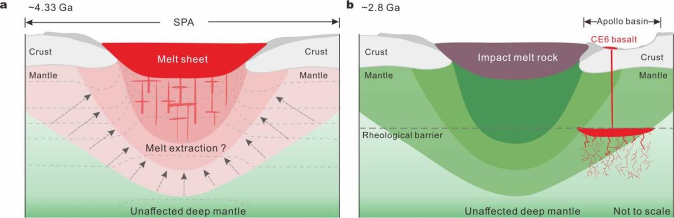 图2:南极-艾特肯(SPA)撞击对深部月幔的影响及随后CE-6玄武岩的形成模型。a,约43.3亿年前SPA盆地形成。流体力学模拟表明,月球内部约250千米的上层发生了熔融,撞击熔体在SPA底部聚集,形成约50千米厚的熔岩席。b,约28亿年前CE-6玄武岩喷发。Rheological barrier代表岩石圈底部。SPA内绝热的巨厚月壤/月壳的移除可能会导致更快的冷却速率以及更深的流变屏障。CE-6玄武岩的月幔源区可能经历了熔体提取,也有可能未受影响。