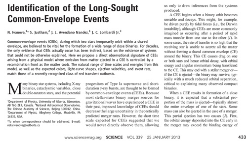 国家天文台恒星与恒星系统研究团组的研究人员Stephen Justham与加拿大、美国合作者建立计算模型,结合双星的公共包层演化从理论上解释了双星中一直未被解释的奇特现象——中等亮度红色瞬变事件(intermediate luminosity red transients,ILRTs)。此项研究结果于2013年1月25日发表在国际上著名的杂志《SCIENCE》第339卷433-435页。