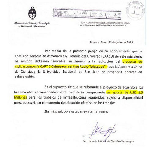 7月22日,中阿合作40米射电望远镜(CART-China-Argentina Radio Telescope)项目获得阿根廷科技创新部(MinCyT)正式立项支持,并批复前期150万美元用于CART园区准备和基础建设。