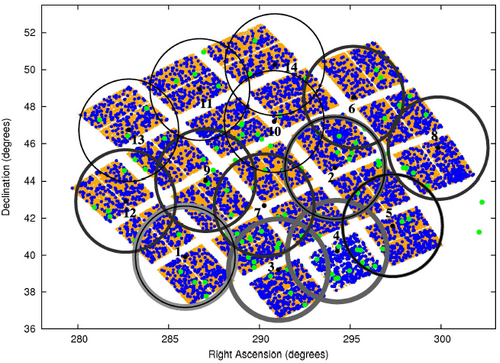 开普勒卫星视场内科学目标的分布图。2011-2014年观测的LAMOST-Kepler子天区分别用由粗到细由灰到黑的圆圈表示。