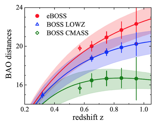 BOSS和eBOSS的BAO探测能力比较。与BOSS相比,eBOSS将在更深、更大的红移范围内测量BAO。