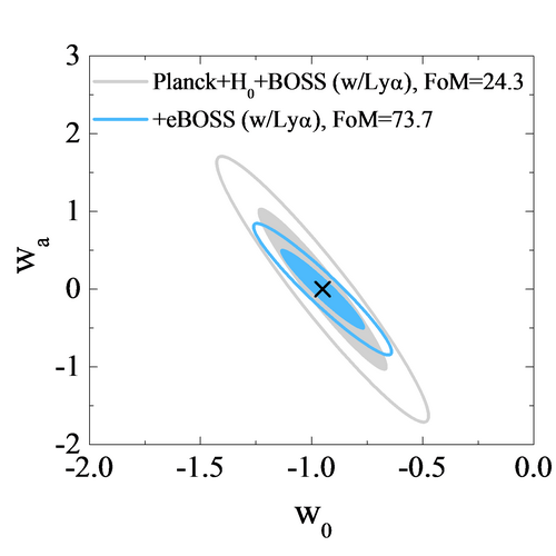 eBOSS巡天对于暗能量状态方程参数的限制预测(蓝色阴影区域)。对比目前的BOSS观测限制(灰色阴影区域),eBOSS巡天将把暗能量状态方程参数的品质因数限制提高3倍(蓝色阴影)。