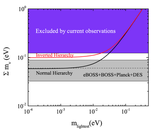 eBOSS巡天对于中微子质量的限制预测(灰色阴影)。如图所示,eBOSS(结合其他观测数据)将有可能首次区分Normal Hierarchy和Inverted Hierarchy两种中微子质量简并模式。上图摘自Zhao et al., 2016 (MNRAS, 457, 2377, arXiv: 1510.08216)。
