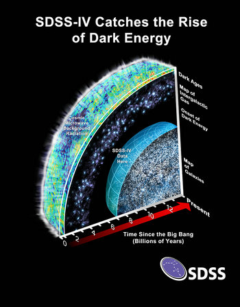2014年7月,作为BOSS的后续项目,“拓展重子声波振荡巡天”(eBOSS;2014-2020)正式启动,是目前世界上正在运行的最大星系光谱巡天计划。该巡天计划依托BOSS项目使用的SDSS 2.5米望远镜,将在7500平方度的天区范围内,在更深的红移,利用多种类型的天体,在1-2%的精度上测量宇宙重子振荡(BAO)和红移畸变(RSD)信号,对于揭示宇宙学核心组分-暗能量属性等前沿研究具有重要意义。在中科院战略先导项目的重点支持下,国家天文台于2013年正式加入SDSS-IV项目,成为所级成员单位(Full Institutional Member)。除eBOSS项目外,SDSS-IV项目还包括近邻星系动力学巡天MaNGA以及银河系巡天APOGEE-II,国家天文台科研人员也已积极深入开展合作研究,并取得了初步成果。