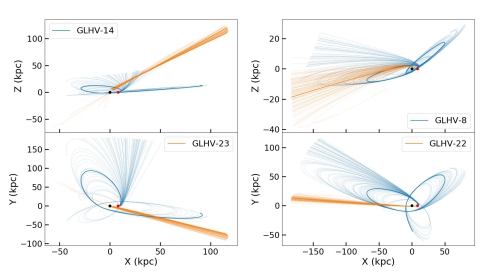 一些高速星代表在空间坐标系中的2 Gyr的回退轨道,细线代表每颗高速星在位置和速度的不确定范围内的100条随机轨道。