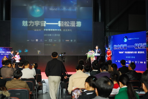 11月9日,“微软杯”宇宙漫游制作大赛颁奖典礼在北京天文馆隆重召开。获奖选手、大赛评委、媒体记者、大赛组织方代表、各界嘉宾约百余人参加了颁奖仪式。北京天文馆馆长朱进研究员致欢迎词,中国天文学会理事长崔向群院士、微软亚洲研究院院长洪小文研究员、微软亚洲研究院副院长宋罗兰研究员、国家天文台副台长郝晋新研究员、华中师范大学副校长杨宗凯教授等为获奖选手颁奖并致辞。最后,微软亚洲研究院洪小文院长做总结发言并宣布颁奖典礼圆满结束。