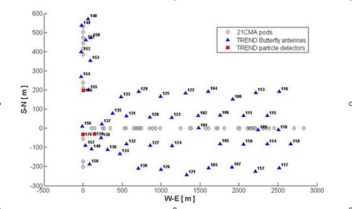 2010年间,21CMA基地把第二套接收系统开辟为低频宇宙射线和中微子探测专用,另外架设了50套“蝴蝶”天线,接收波段覆盖50-100MHz,时间分辨率5纳秒,在测试的一个月里就发现了多个有效事例。TREND实验初期结果(28个完全确认的事例)在Astroparticle Physics发表(arXiv:1007.4359)。虽然首篇论文报道的是宇宙射线实验结果,但其深远的意义在于,TREND将成为天山深处的宇宙τ中微子探测器或中微子望远镜,如果未来把21CMA天线用作中微子望远镜,则规模将是空前的。至此,我们已经拥有了第一部可能以低频射电方式探测宇宙中微子的望远镜。