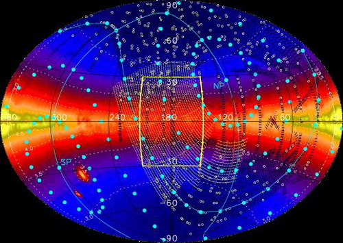盱眙近地天体望远镜测光巡天天区(中心黄色点区域)以及后续郭守敬望远镜光谱巡天天区(中心黄色桶形区域)