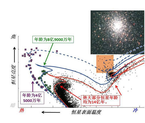 在NGC1783的数据中发现的两支年轻恒星(绿色方块为第一支;紫色方块,以及紫色方块右侧浅红色区域内的黑点为第二支),它们严格地分布在两条理论计算出的等年龄线上(蓝色实线和虚线),这意味着它们是在两个不同时间节点爆发性形成的。再加上星团最初包含的一批恒星(由红色实线描述的黑点),这一星团明显包含有三支年龄截然不同的恒星成分。