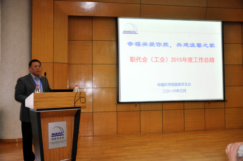 党委书记赵刚在致辞中肯定了一年来台职代会(工会)的工作,希望各位代表群策群力、畅所欲言,积极为天文台的发展、建设建言献策;希望台工会能够继续坚持在党的领导下开展工作,充分发挥好台领导联系广大职工群众的桥梁和纽带作用。职代会主席魏建彦向与会代表做了职代会(工会)2015年度工作报告,从“改革创新”、“崇德扬善”、“亲情互助”、“共建家园”四个方面总结职代会(工会)进行换届选举、维护职工群众合法权益、开展文化体育活动以及各协会和分工会开展工作的情况,并向与会代表报告了工会经费收支和审查情况,经审查,2015年度工会经费使用符合规定,没有超出预算支出。